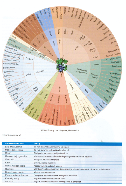 Als hulp bij het duiden van geuren en smaken kan gebruik gemaakt worden van onderstaand 'aromawiel'.